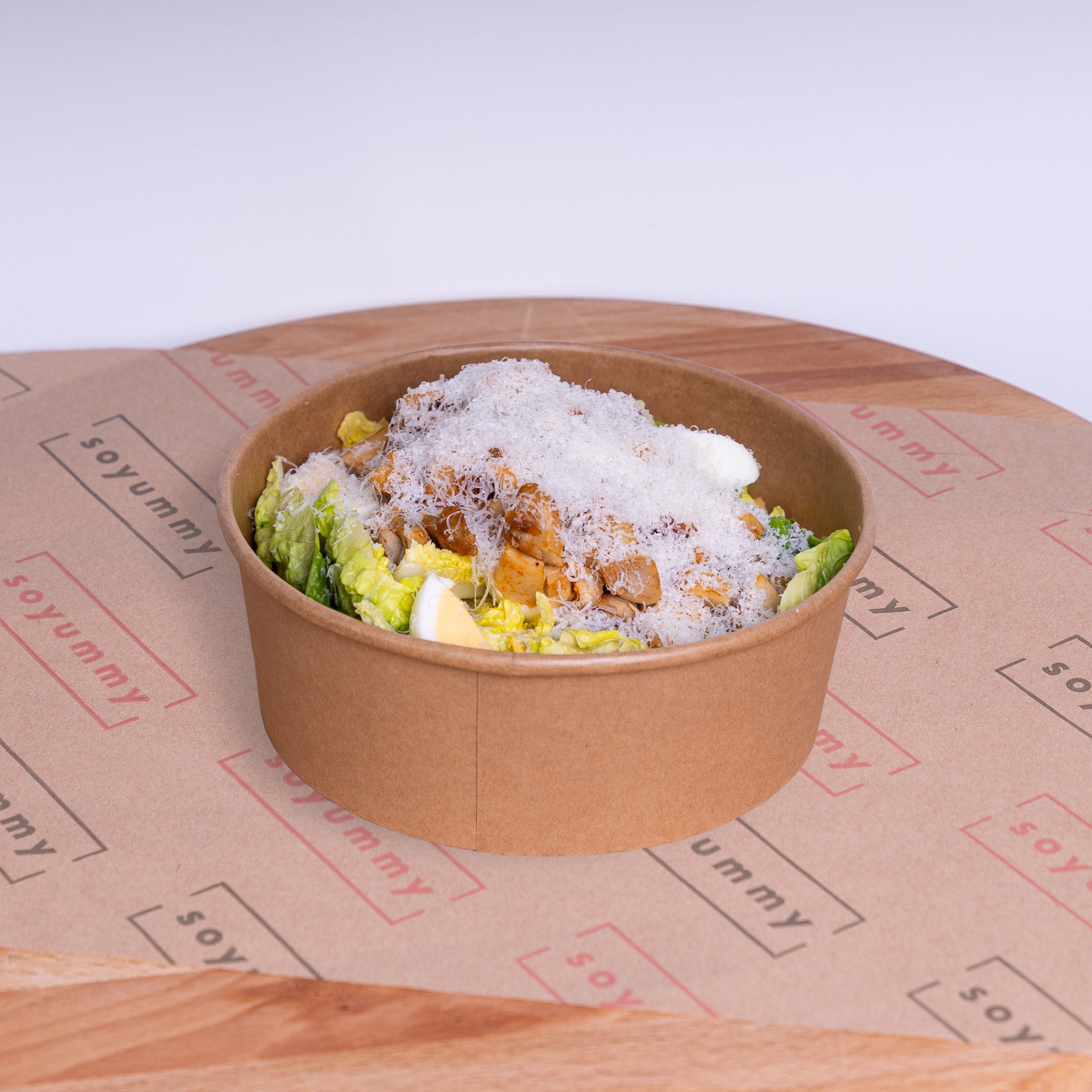Little gem sla - kippendijen - ansjovis - gekookte ei - parmezaanse kaas - croutons - caesar dressing. De salades komen standaard met 1 bakje dressing.
