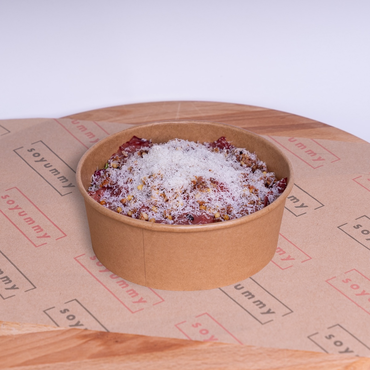 Slamix - carpaccio - pijnboompitjes - komkommer - tomaat - parmezaanse kaas - spekjes - huisgemaakte pesto of truffelmayonaise. De salades komen standaard met 1 bakje dressing.