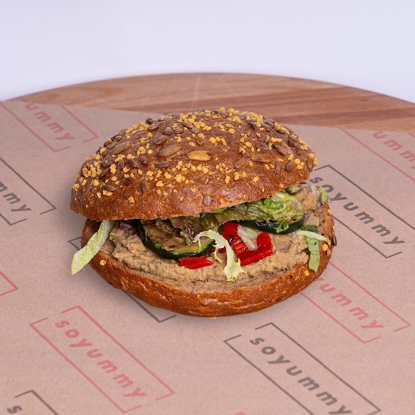 Huisgemaakte hummus - gegrilde courgette - rode paprika - sla Let op: het wit brood en de focaccia zijn niet vegan!
