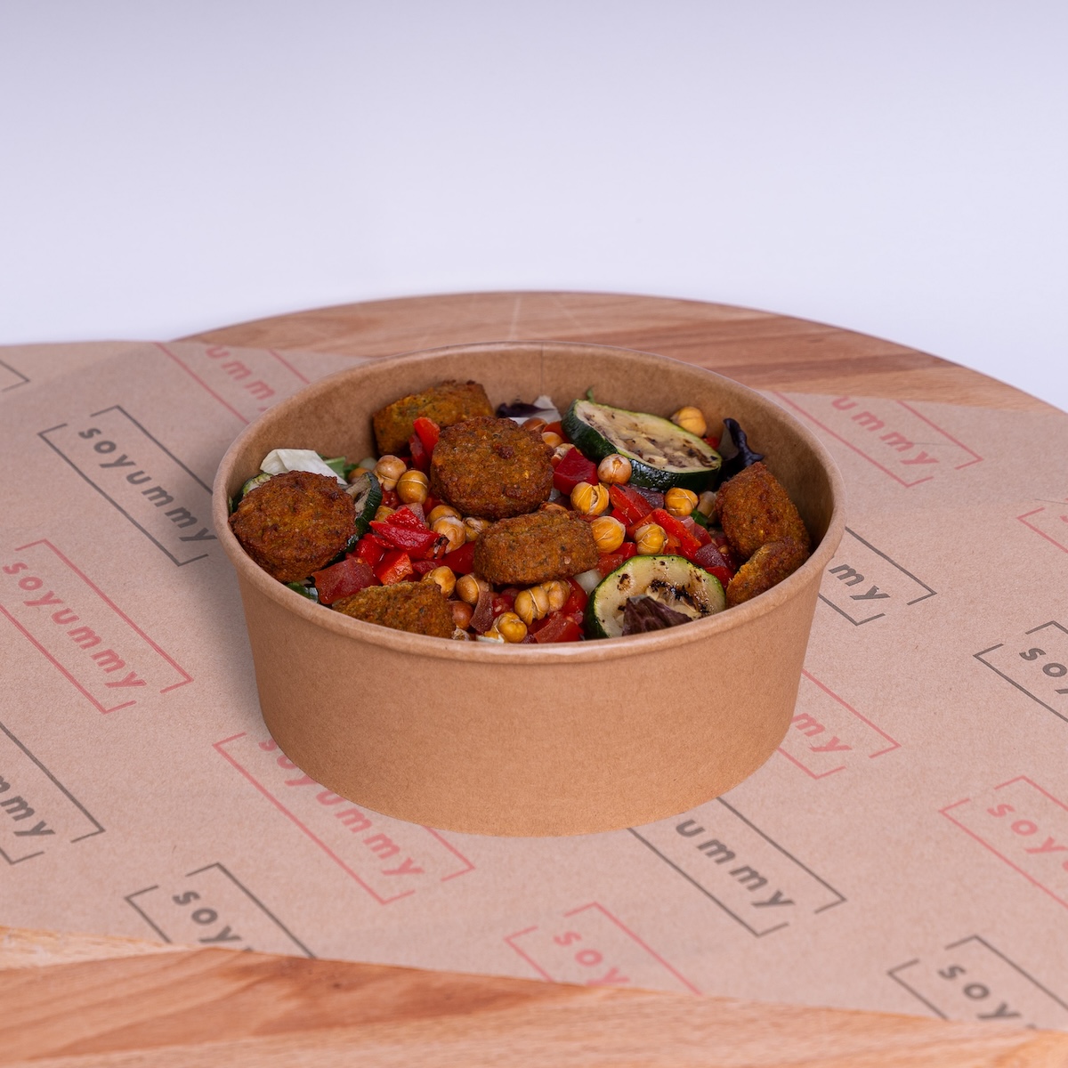 Slamix - komkommer - tomaat - gegrilde paprika en courgette - falafel - krokante kikkererwten - mosterd-dille dressing (apart). De salades komen standaard met 1 bakje dressing.