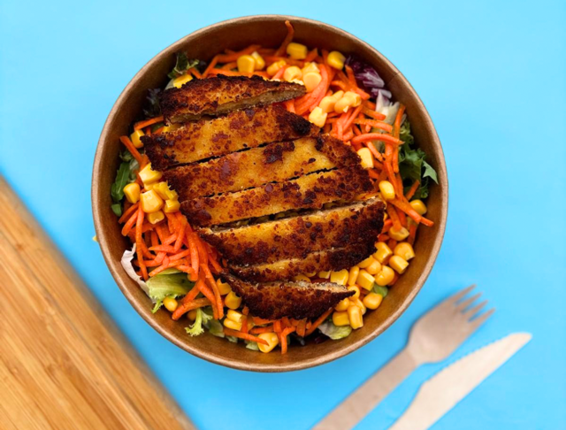 Slamix - maïs - wortel - komkommer - krokante kip - mango-yoghurt dressing. De salades komen standaard met 1 bakje dressing.
