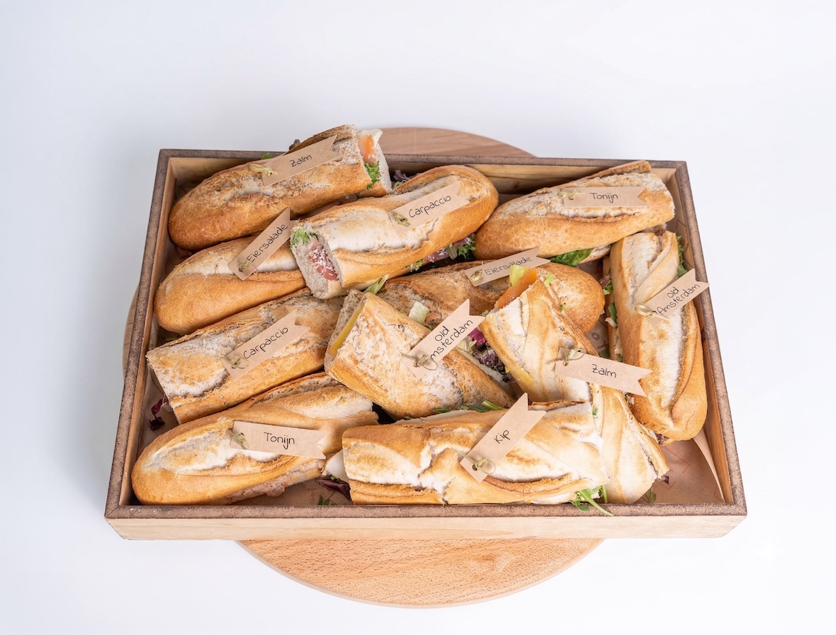 lunchbox met daarin 2 stokbroodjes p.p. divers belegd (mix van vis/vlees/vega). Te bestellen vanaf 4 personen. Let op: deze box dient een dag van tevoren voor 17:00 besteld te worden. Deze box is niet glutenvrij te bestellen!